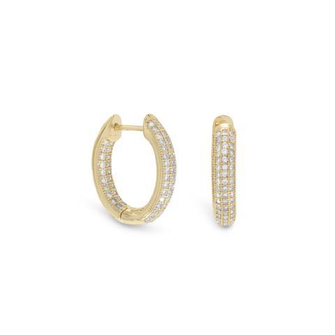 14 karat gold plated sterling silver 3.8mm three row CZ In/Out hinged hoop earrings. The earrings hang approximately 16.5mm.