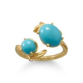 14 karat gold plated sterling silver split ring with a 2.2mm wide decorative branch band featuring 2 individual prong set smooth reconstituted turquoise stones on opposing sides measuring 6mm and 10mm x 8mm. The decorative branch also has 3 individual 1mm bezel set white sapphire stones This ring is available in wholesale sizes 5-9 with each size being slightly adjustable.