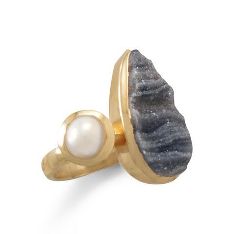 14 karat gold plated sterling silver 2.8mm wide band featuring a 7mm bezel set cultured freshwater button pearl next to a 10mm x 20mm pear shaped desert druzy. This ring is available in whole sizes 6-10.