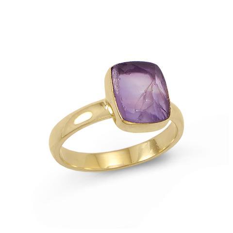 14 karat gold plated sterling silver 3mm wide band ring featuring an 8.5mm x 10.5mm bezel set rough cut amethyst rounded rectangle. This ring is available in whole sizes 5-9.