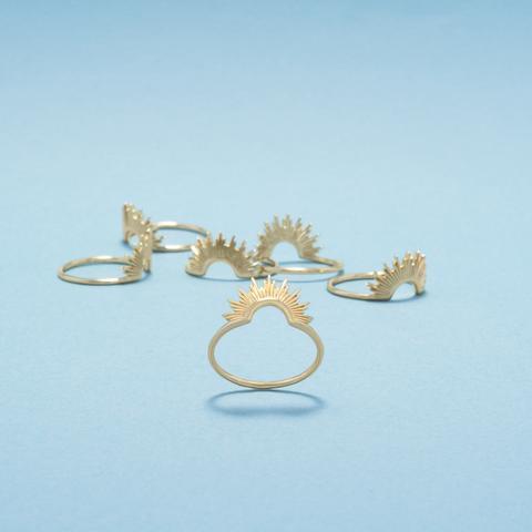 14 karat gold plated sterling silver intricate sun design ring with a 1.2mm wide band. This ring is available in whole sizes 5-9. Wear it alone, or stack two inverted on top of each other to create a full sun design!
